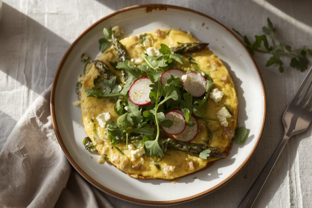 The Ingredients: Fold in whatever is showing up at the market—asparagus, pea shoots, ramp pesto, or soft goat cheese