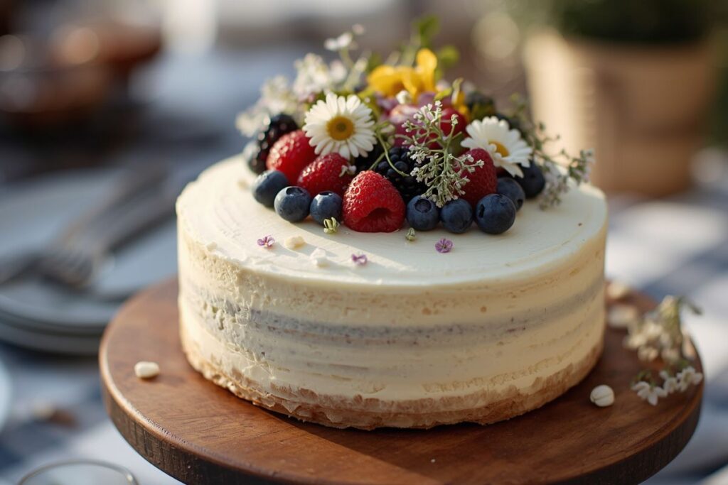 Start with a simple, high-quality cake from a local bakery or grocery store. Then elevate it with a few thoughtful touches—edible flowers (like pansies or lavender), fresh blackberries, or a light dusting of shimmer for a celebratory finish.